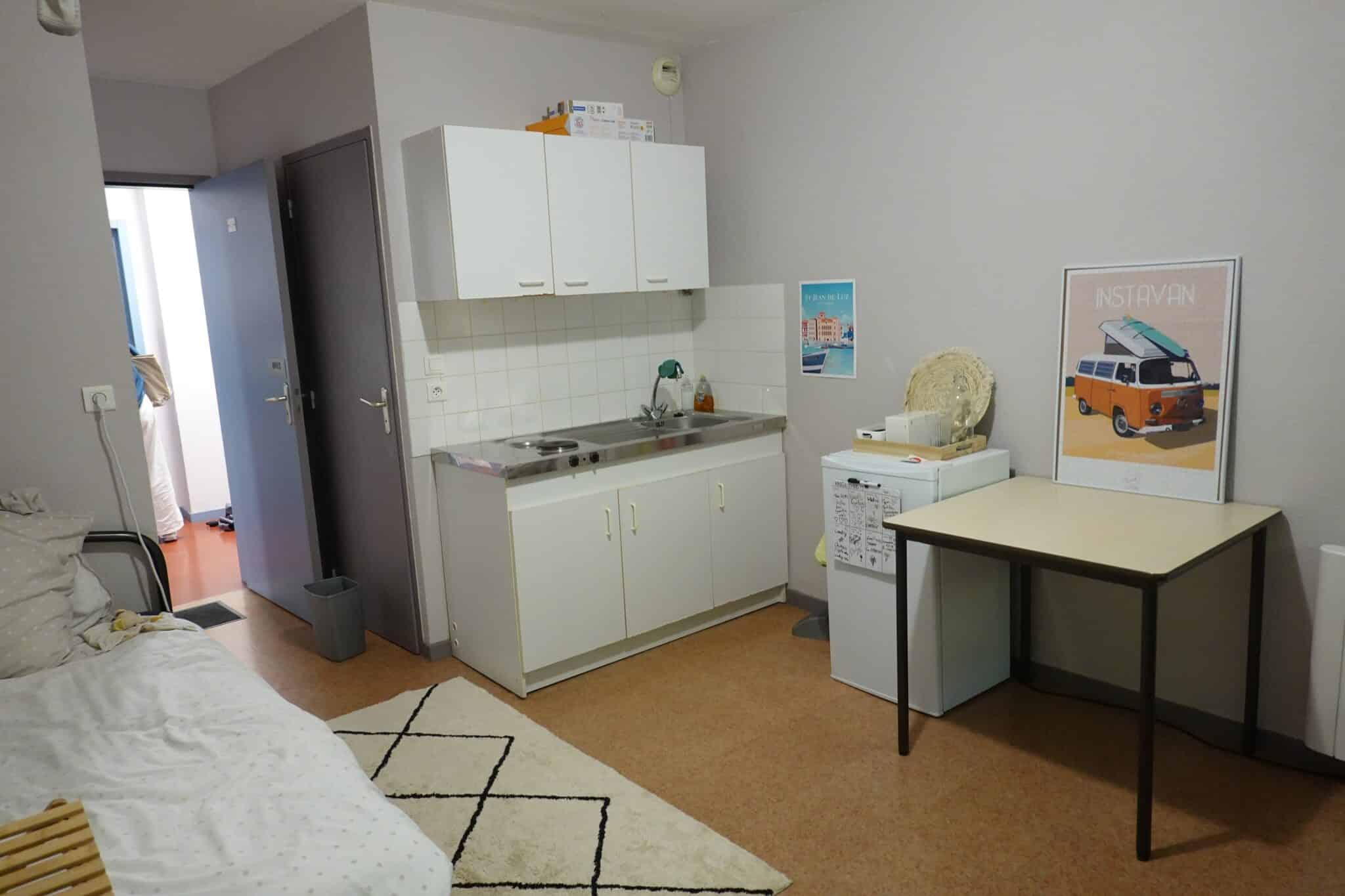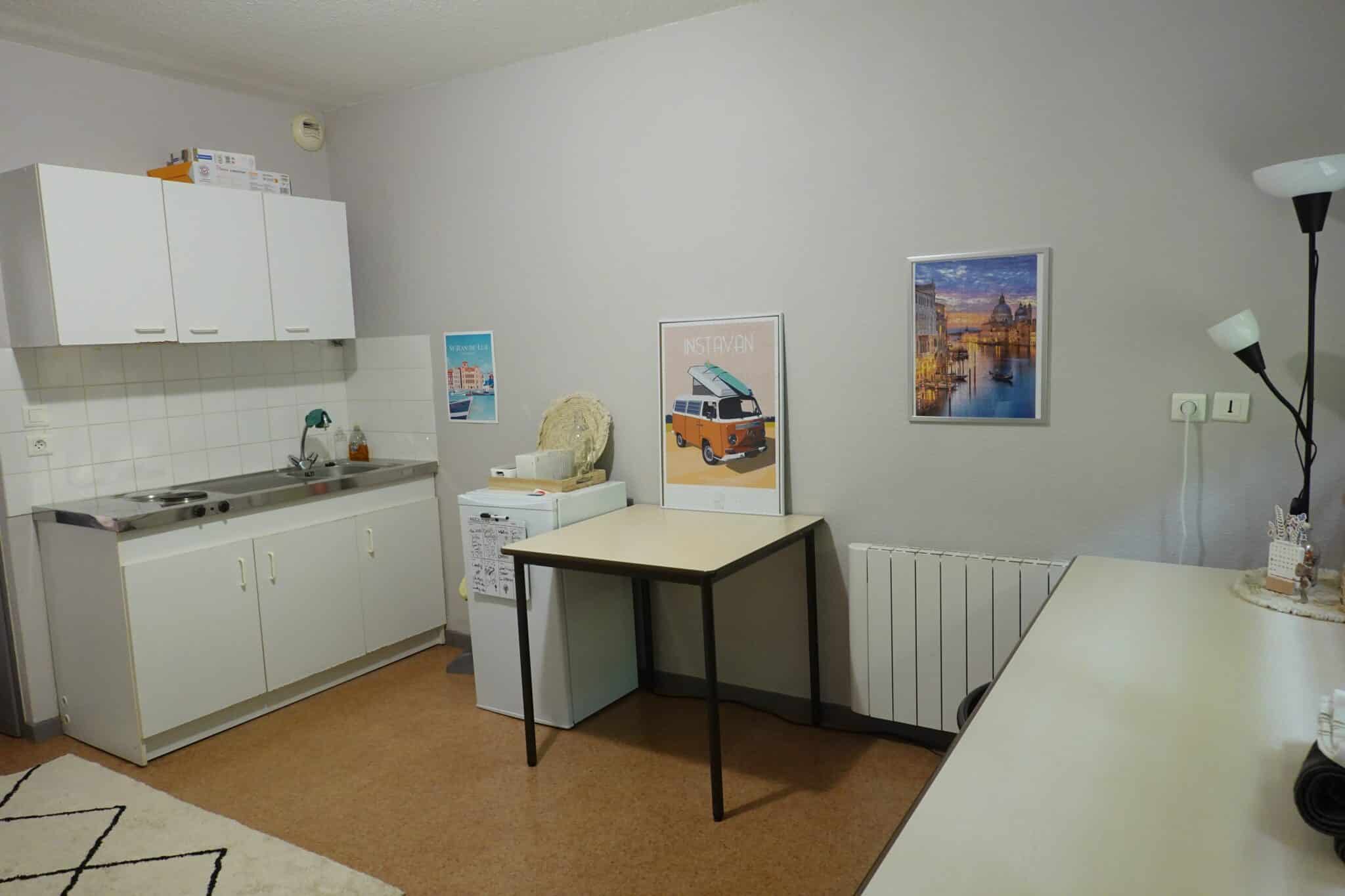 – un coin cuisine (évier, plaques électriques, réfrigérateur),